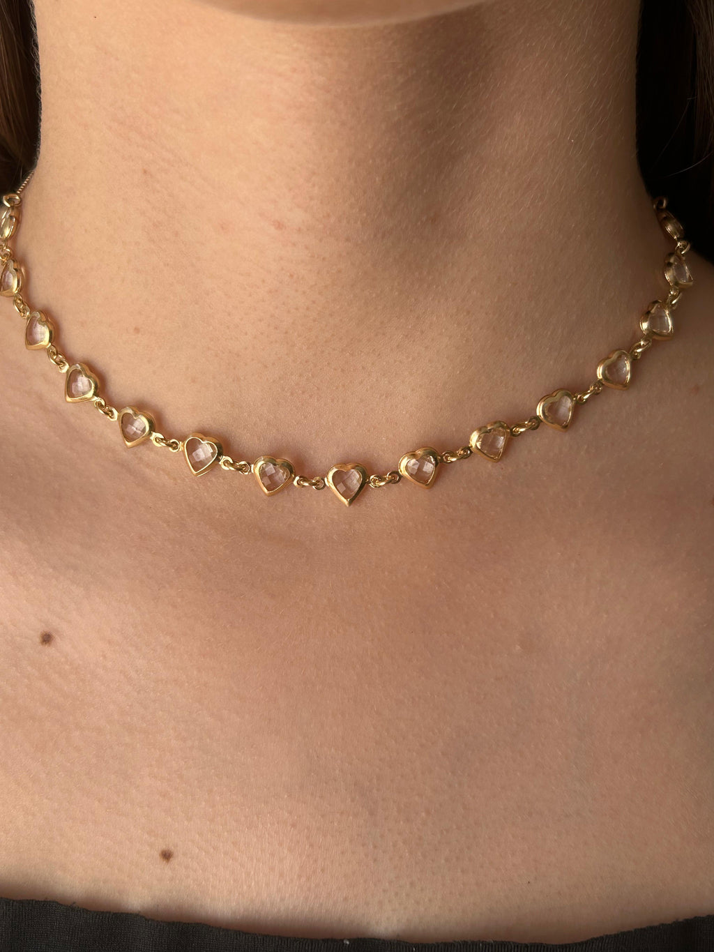 Choker banhado a ouro 18k com delicados corações em cristal translúcido. Design romântico, brilho suave e acabamento refinado que realça o colo com elegância discreta.