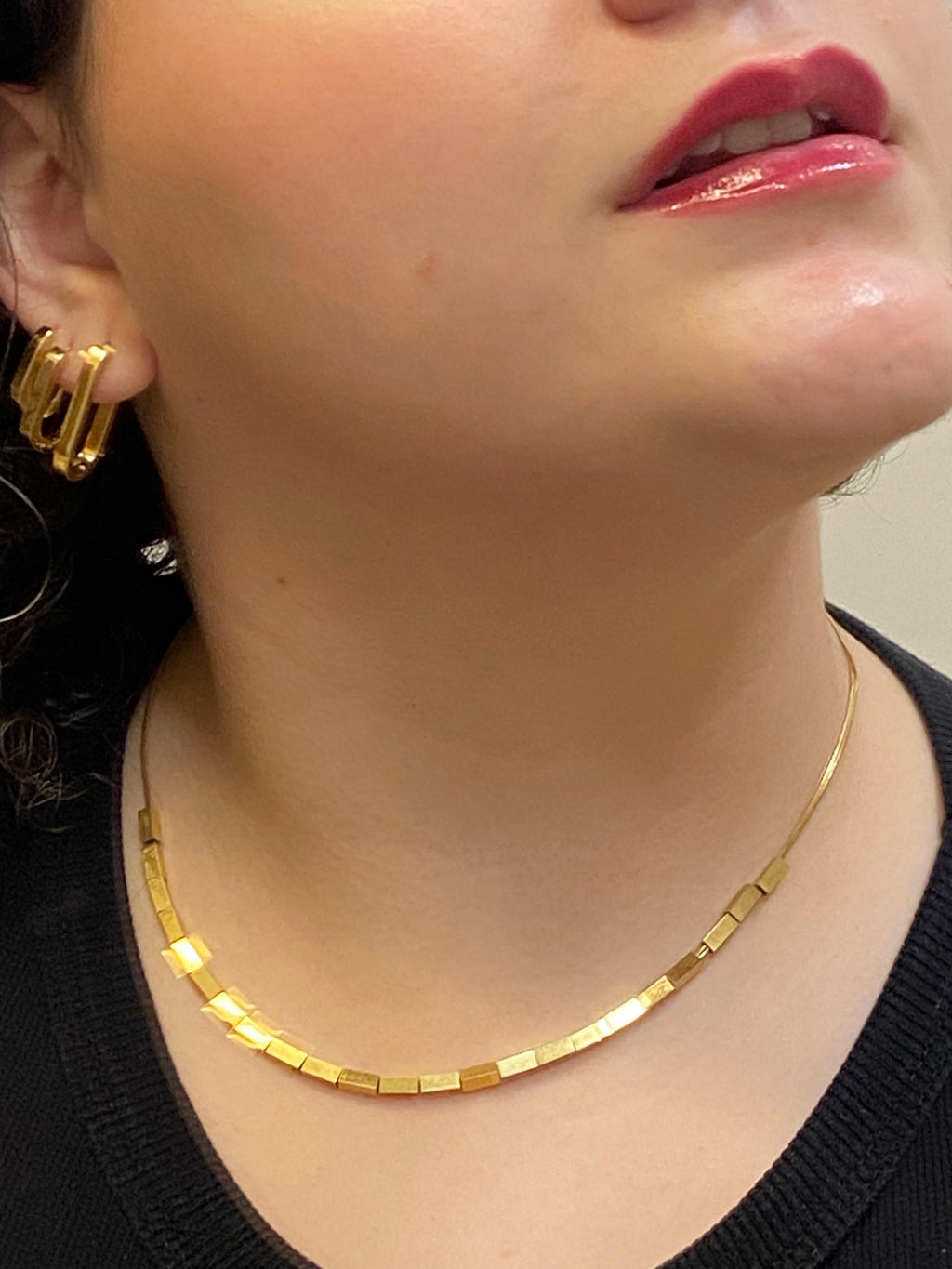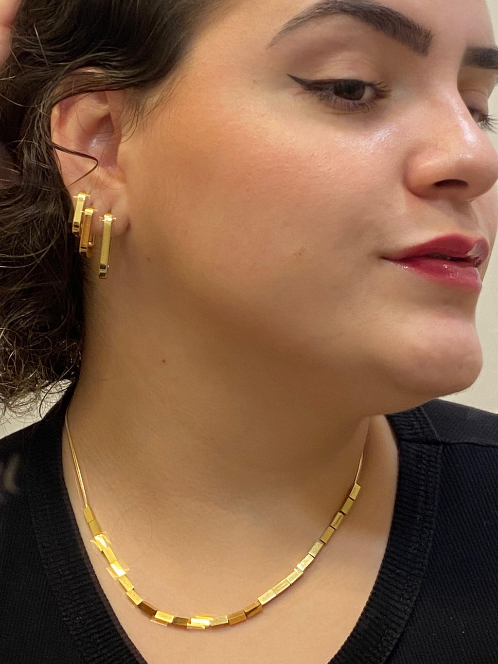 Folheado em ouro, com sequência de cubos polidos e alinhados. Design moderno e minimalista, perfeito para adicionar sofisticação discreta a qualquer produção.
