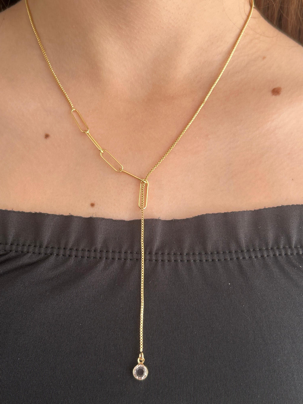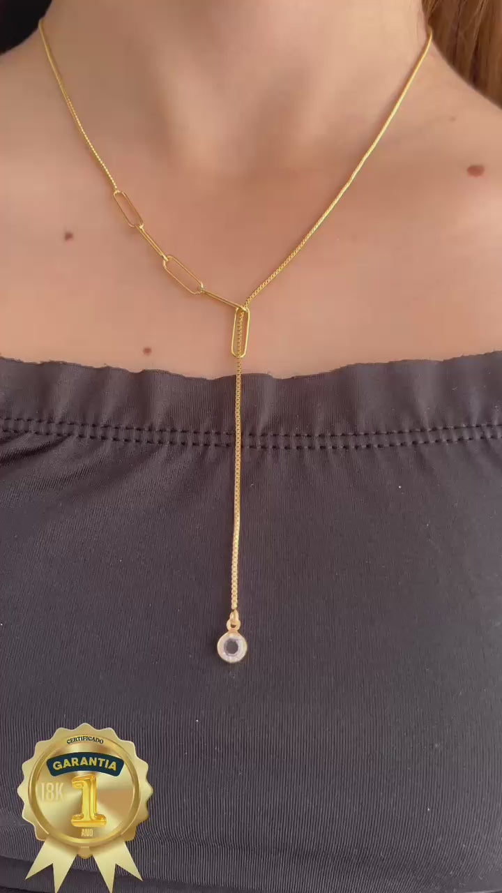 Banhado em ouro 18k, combina elos alongados e corrente fina com pingente de cristal lapidado. Design moderno e delicado para iluminar o colo com elegância sutil.