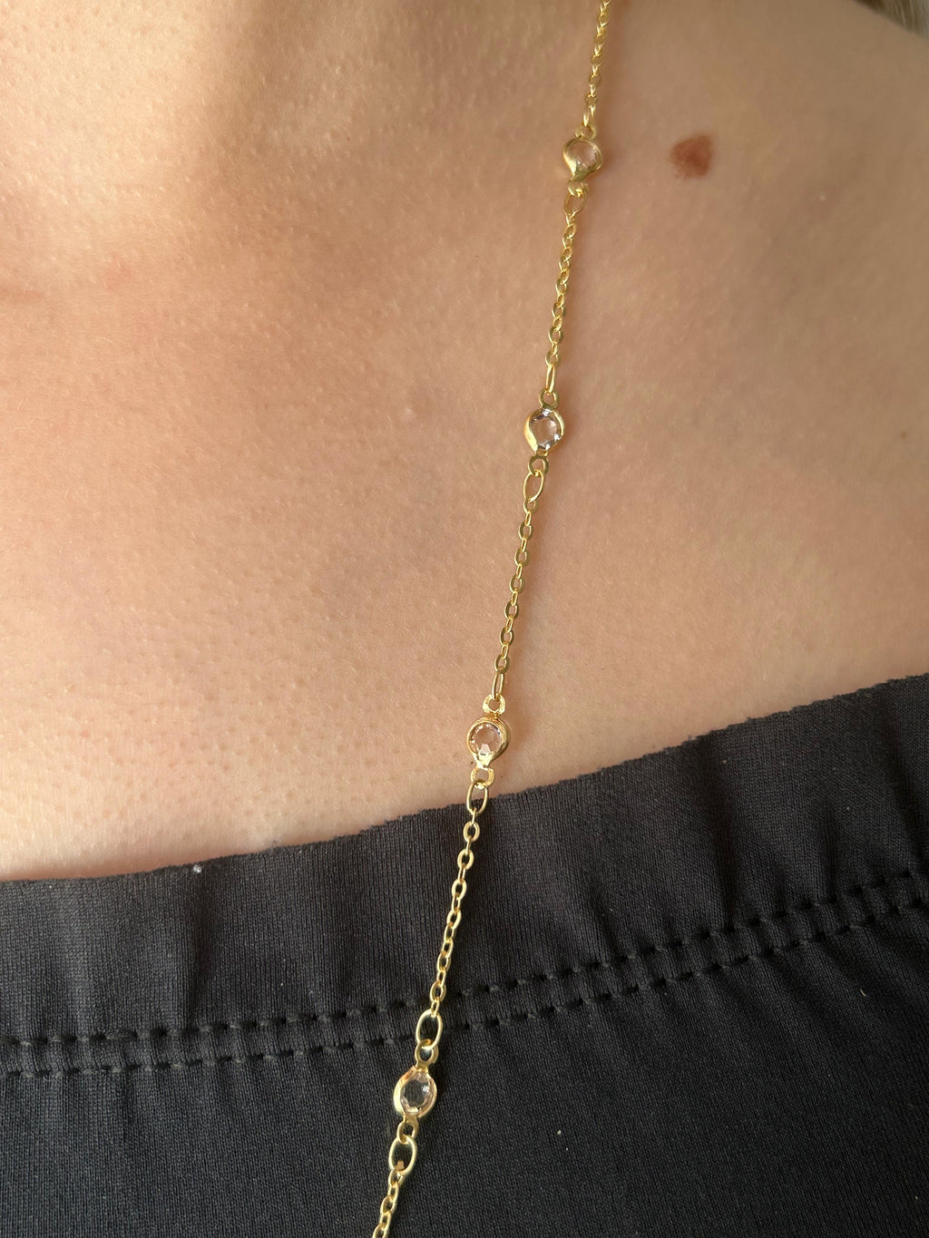 Banhado em ouro 18k com elos intercalados por pedras transparentes que trazem brilho sutil e elegante, ideal para compor desde looks casuais até produções mais refinadas.