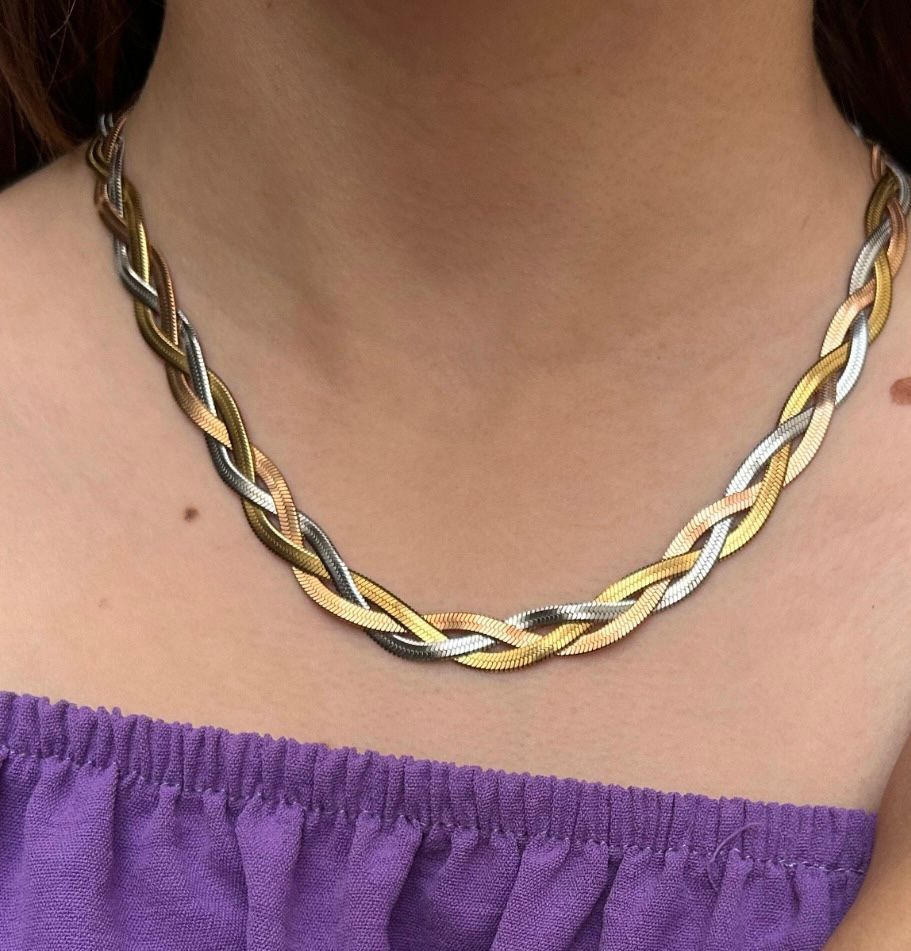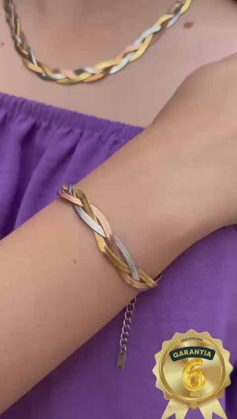 Fios folheados em ouro, prata e rosê entrelaçados em design fluido. Contraste sofisticado e brilho equilibrado para composições modernas e elegantes.