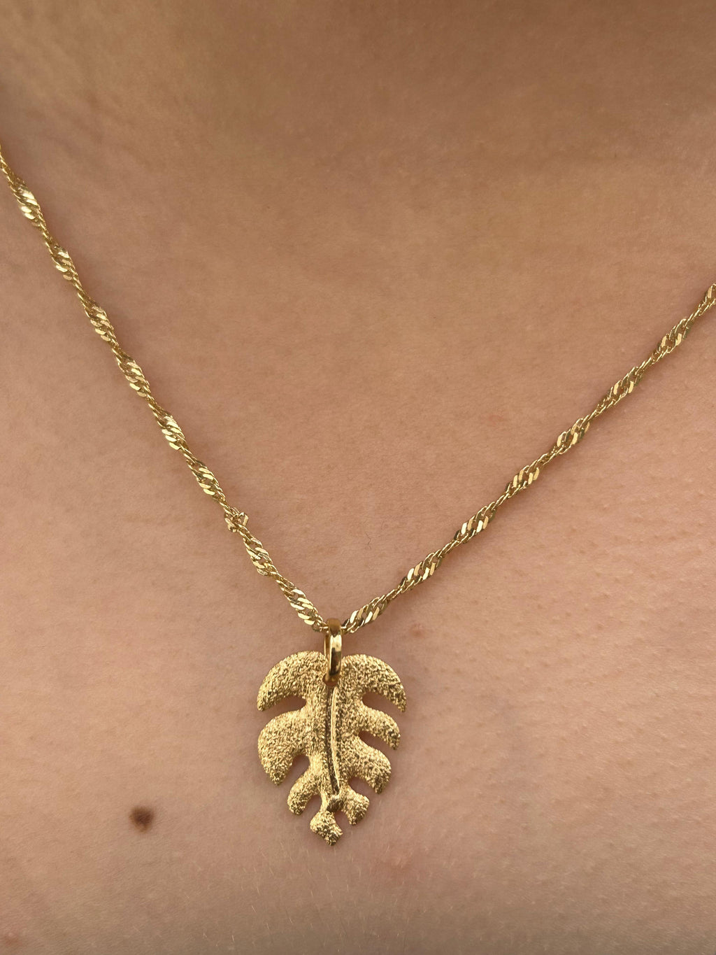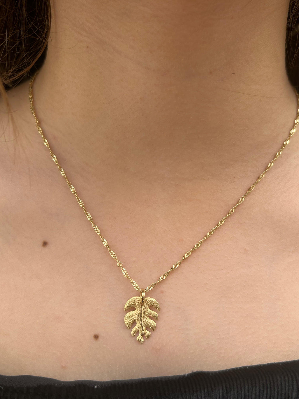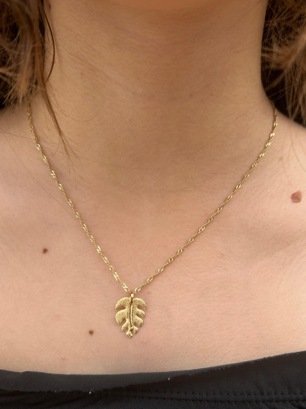 Corrente delicada com pingente banhado1 a ouro 18k em formato de folha costela de adão. Design tropical, acabamento polido e brilho suave que exala sofisticação natural.