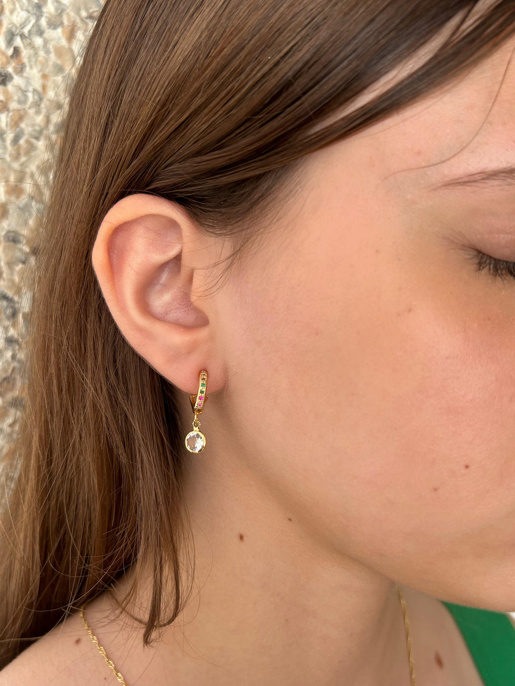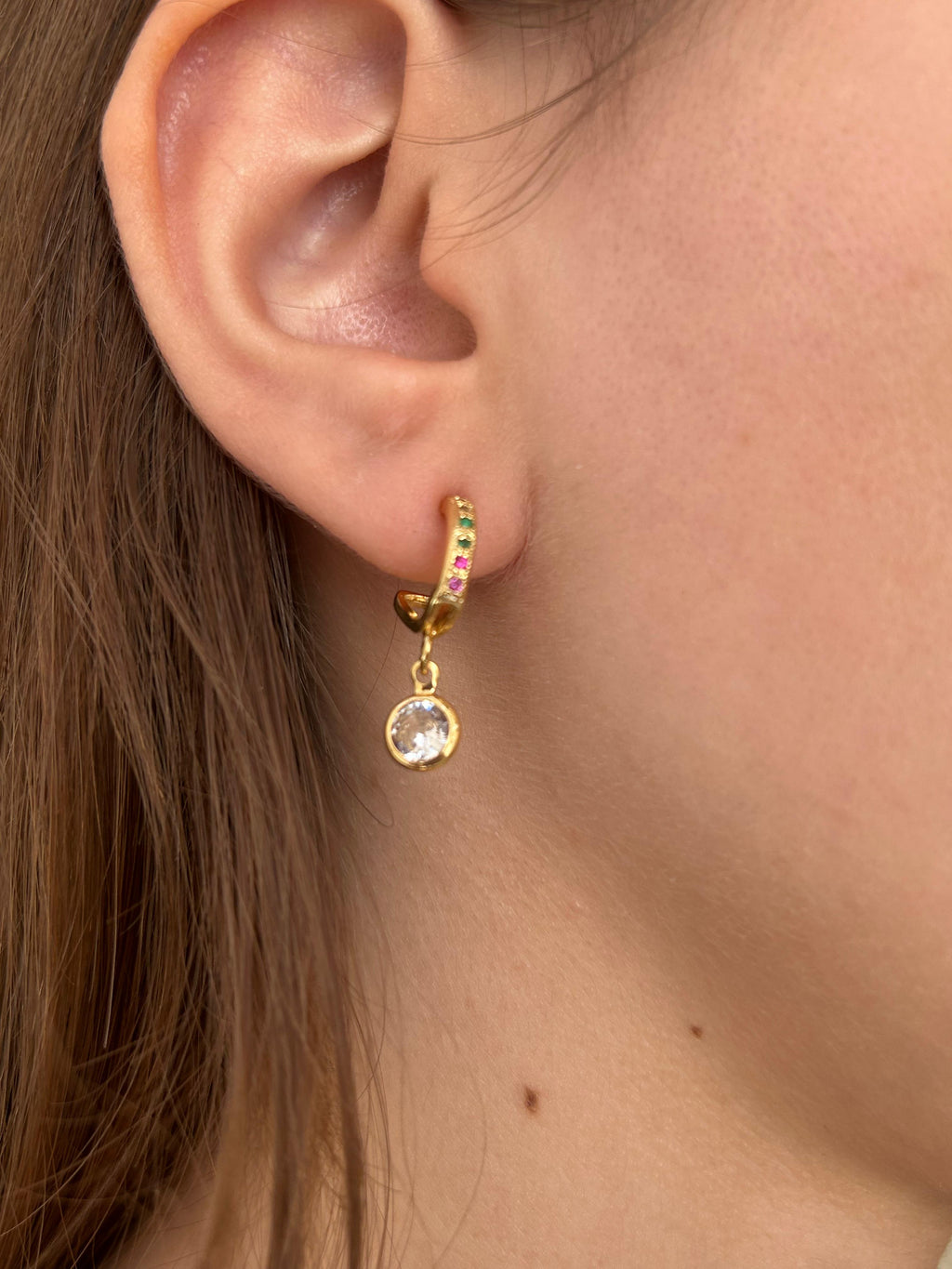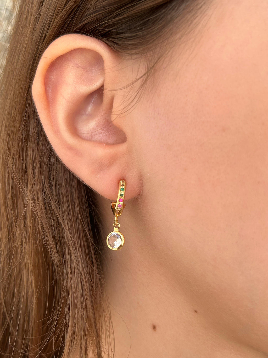Banhado em ouro 18k, com arco cravado de zircônias multicoloridas e pingente de cristal lapidado. Design delicado e luminoso para realçar produções com charme e sofisticação.