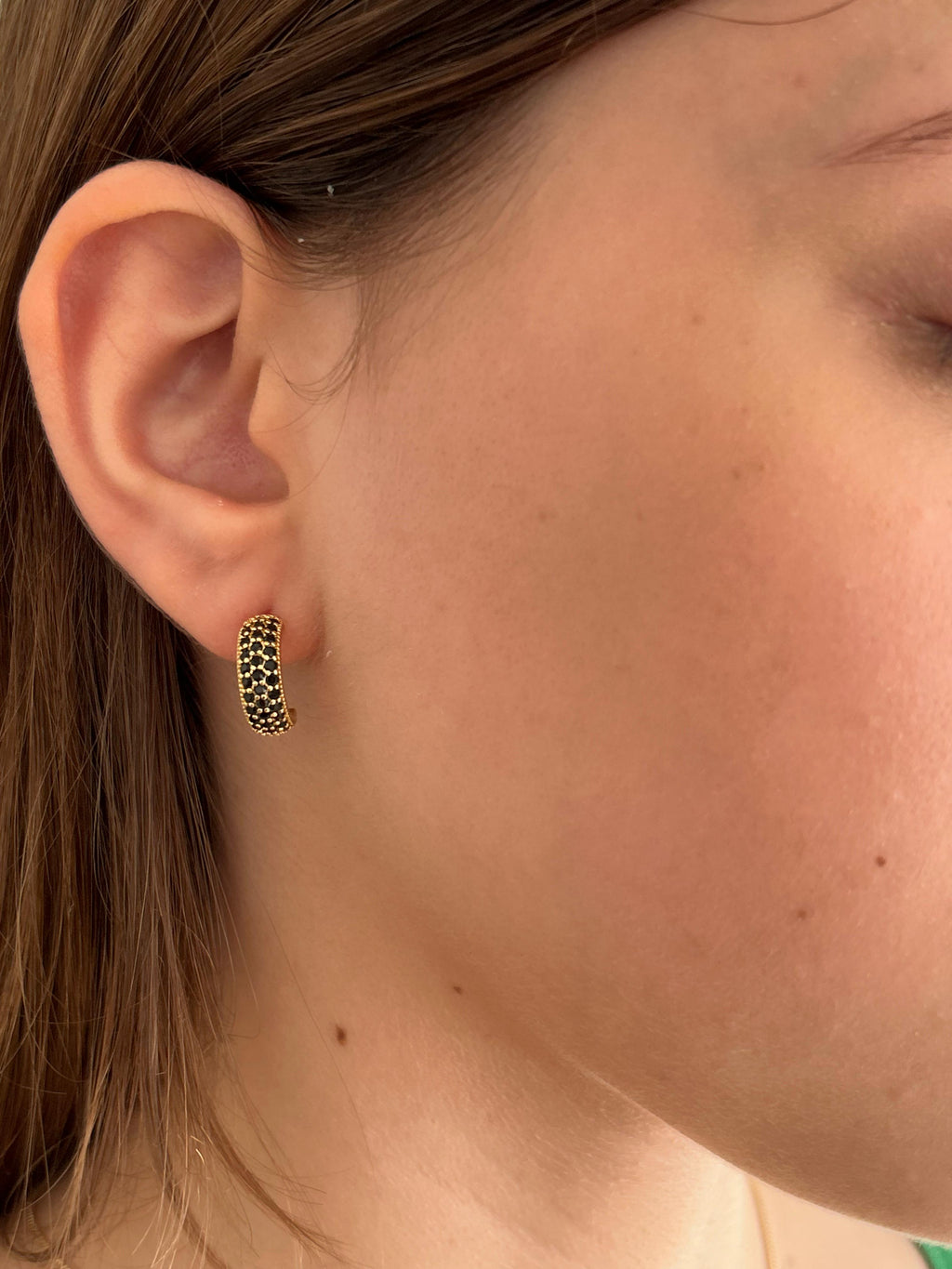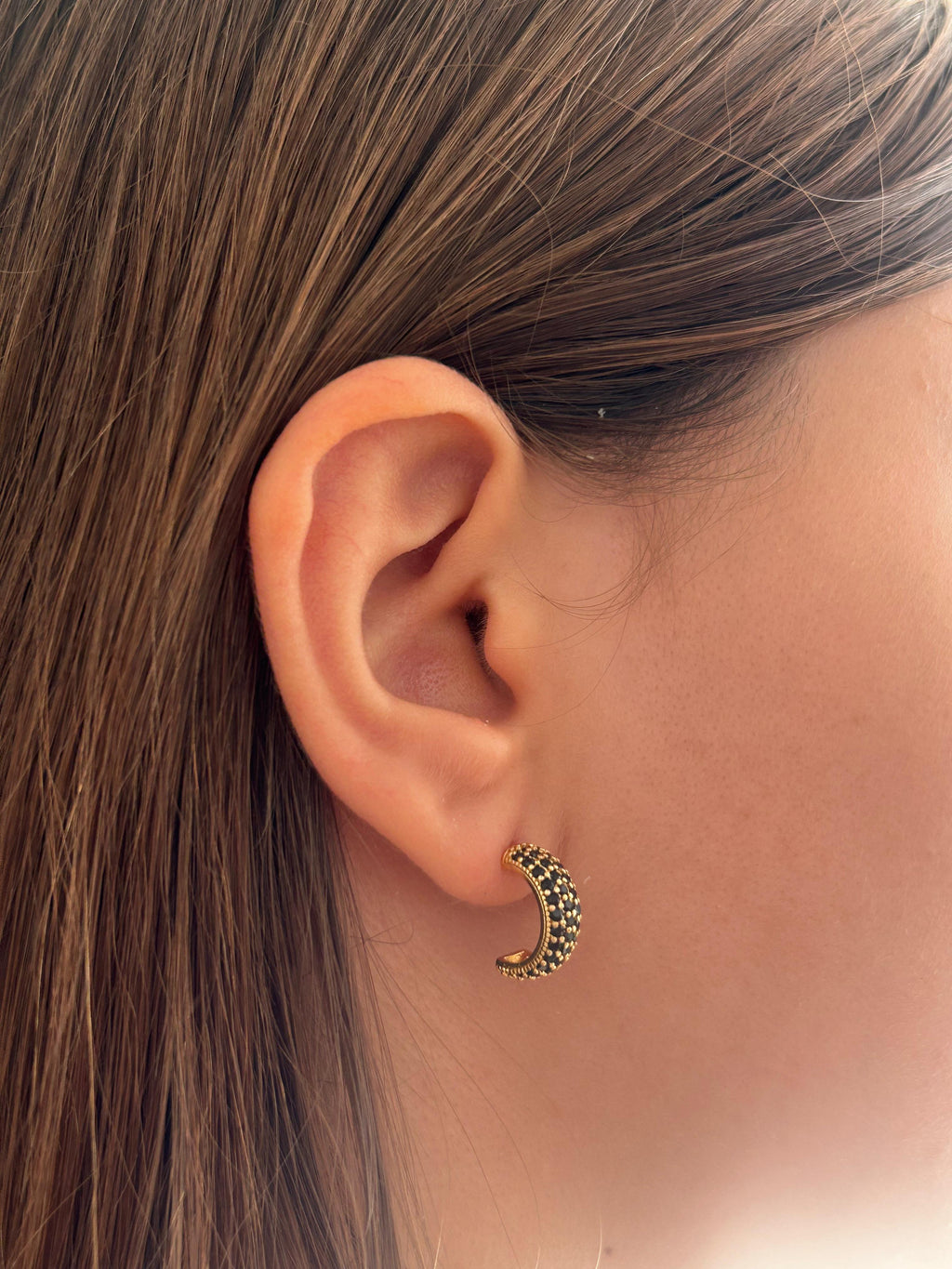 Banhado em ouro 18k, modelo meia lua cravejado com zircônias negras. Design sofisticado e marcante, ideal para adicionar elegância e contraste às produções.