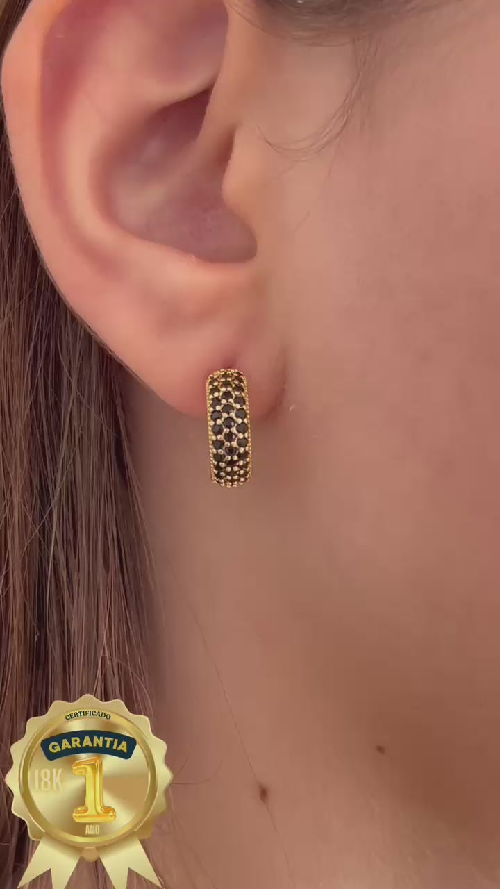 Brinco Argolinha Meia Lua com Zircônia Preto Banhado a Ouro 18k