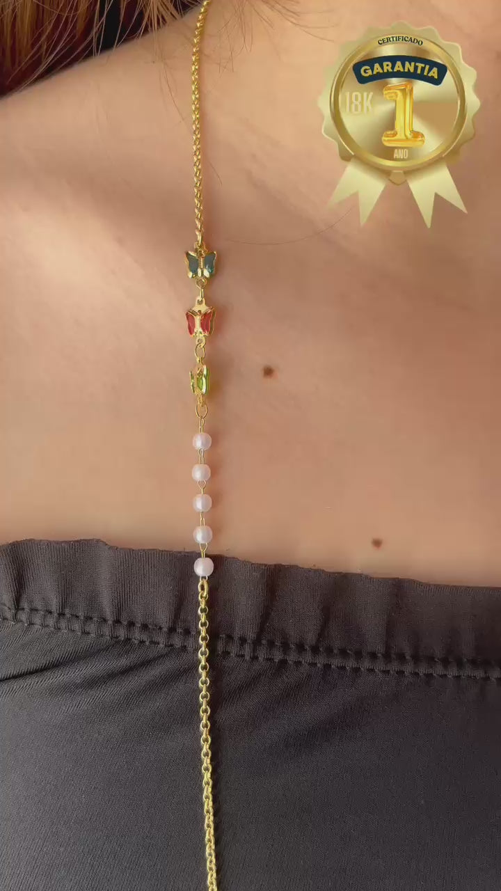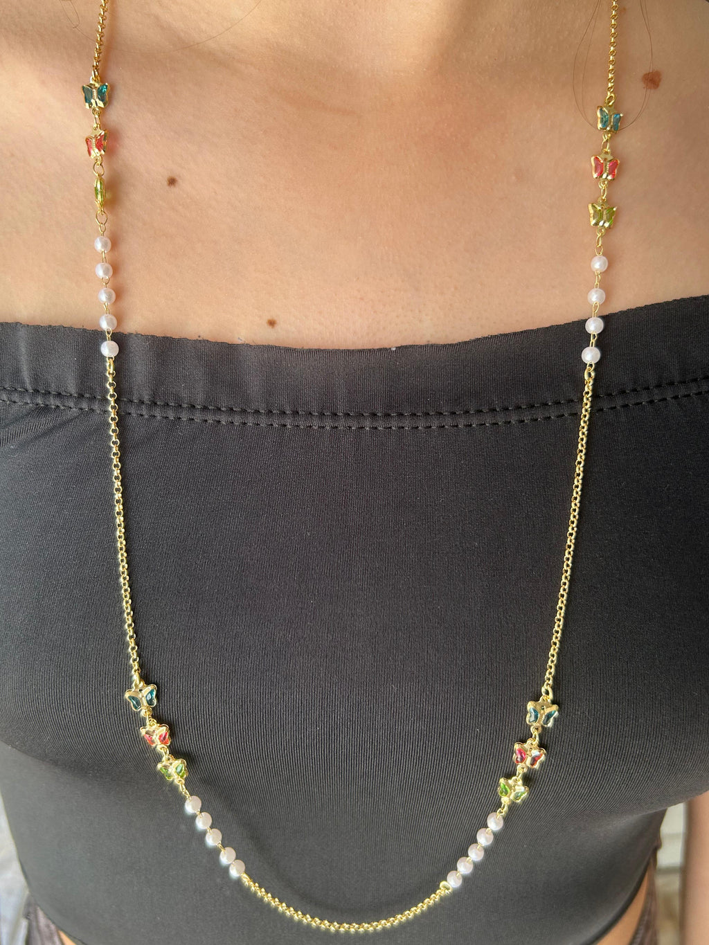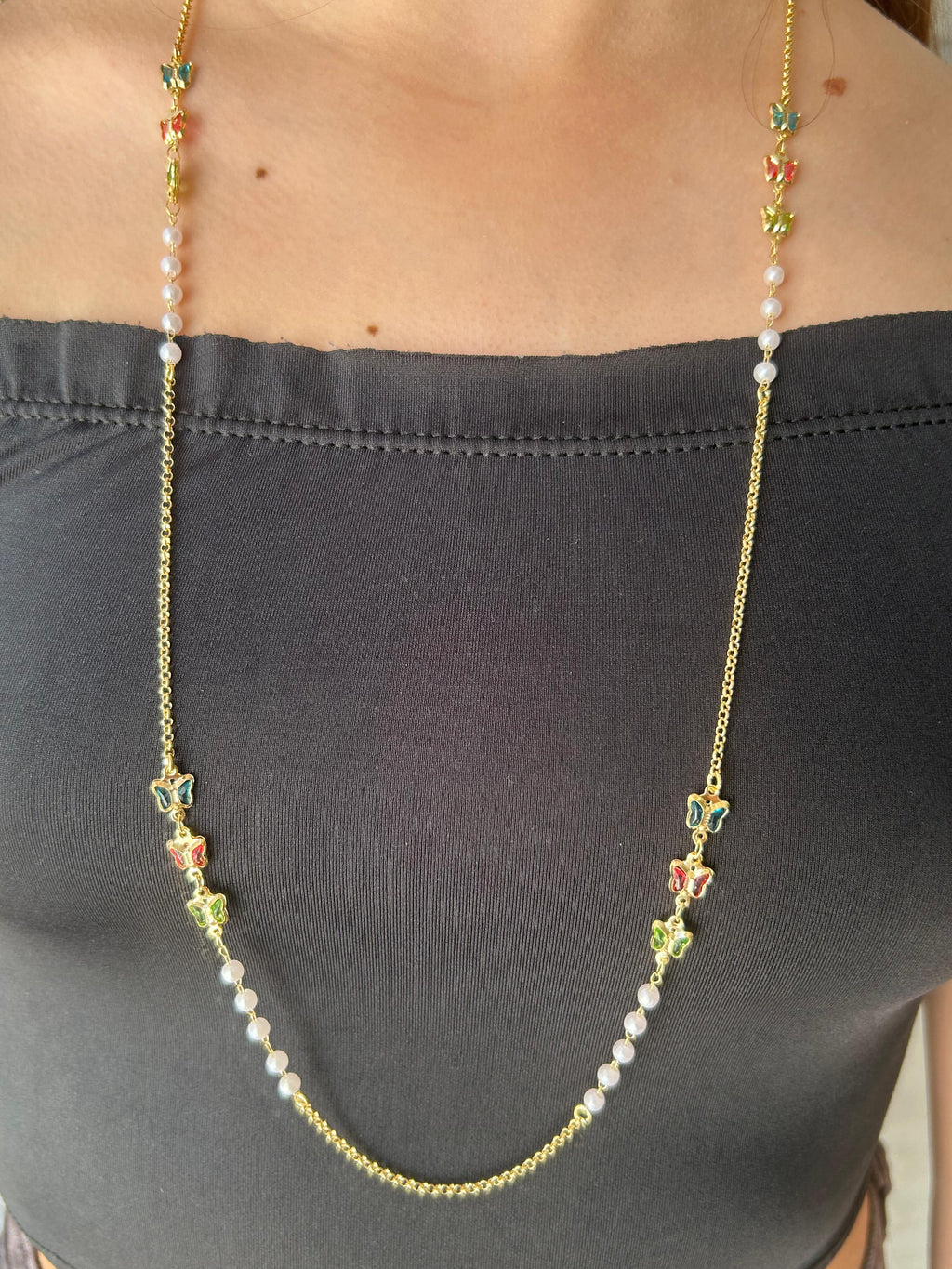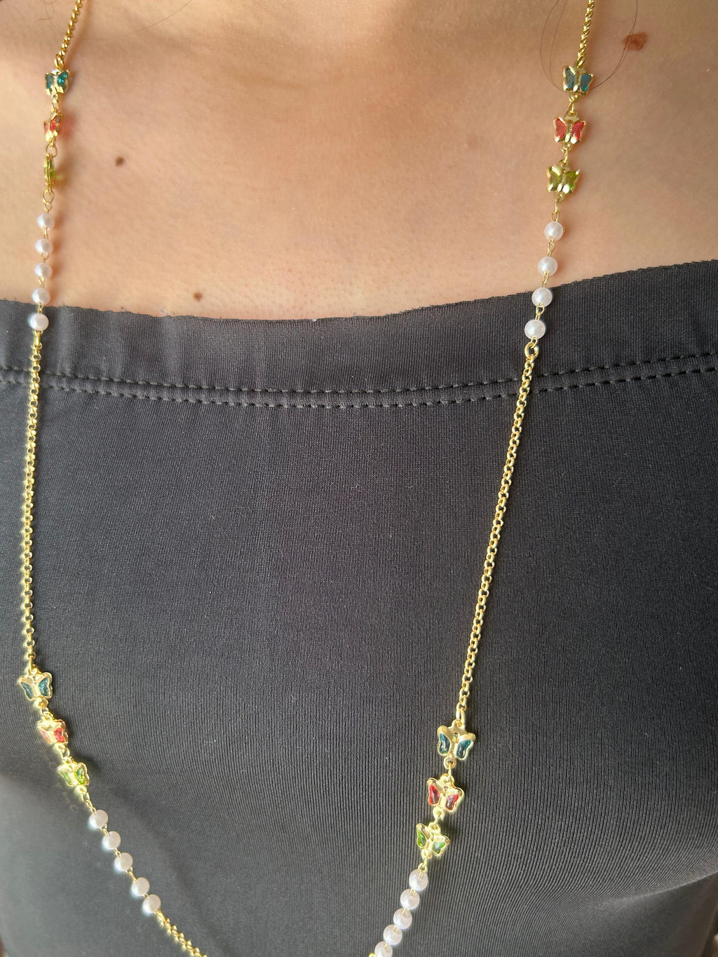 Colar e pulseira banhado em ouro 18k com delicadas borboletas coloridas e detalhes em pérolas. Design romântico e encantador para compor looks com leveza e sofisticação.